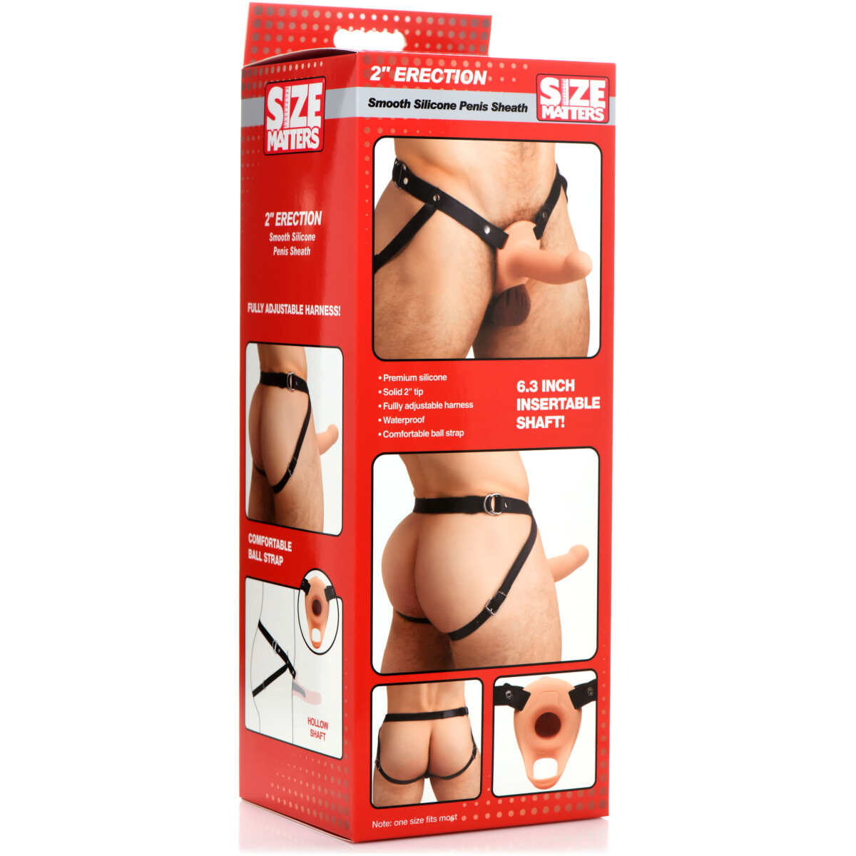 • Hollow Body with Solid Tip and Ball Ring: Insert your penis into the hollow sheath. At the end of the sheath is a 2 inch tip with a round head that adds length along with the girth of the sheath to your shaft. At the base of the sheath is a stretchy ring to wrap around your balls and help keep the sheath in place.