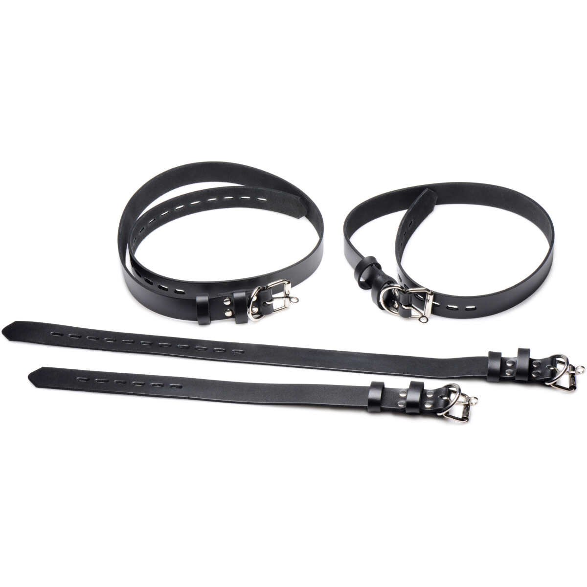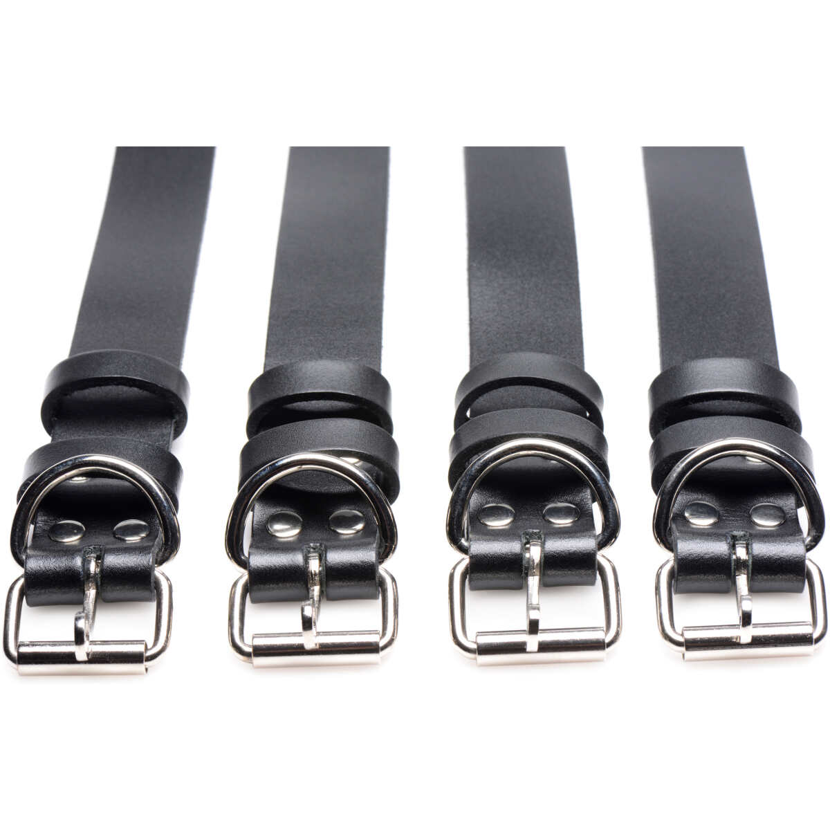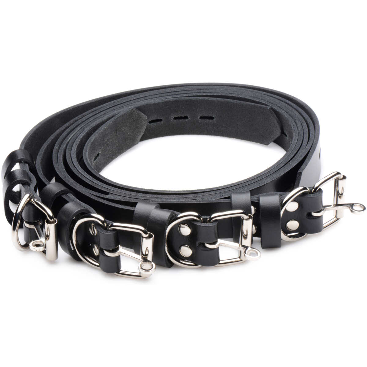 This versatile set of straps provides you with 4 Leather Bondage Straps of different lengths so you can explore and restrain with greater freedom. Use these straps to restrain different body parts or in combination with other bondage delights!