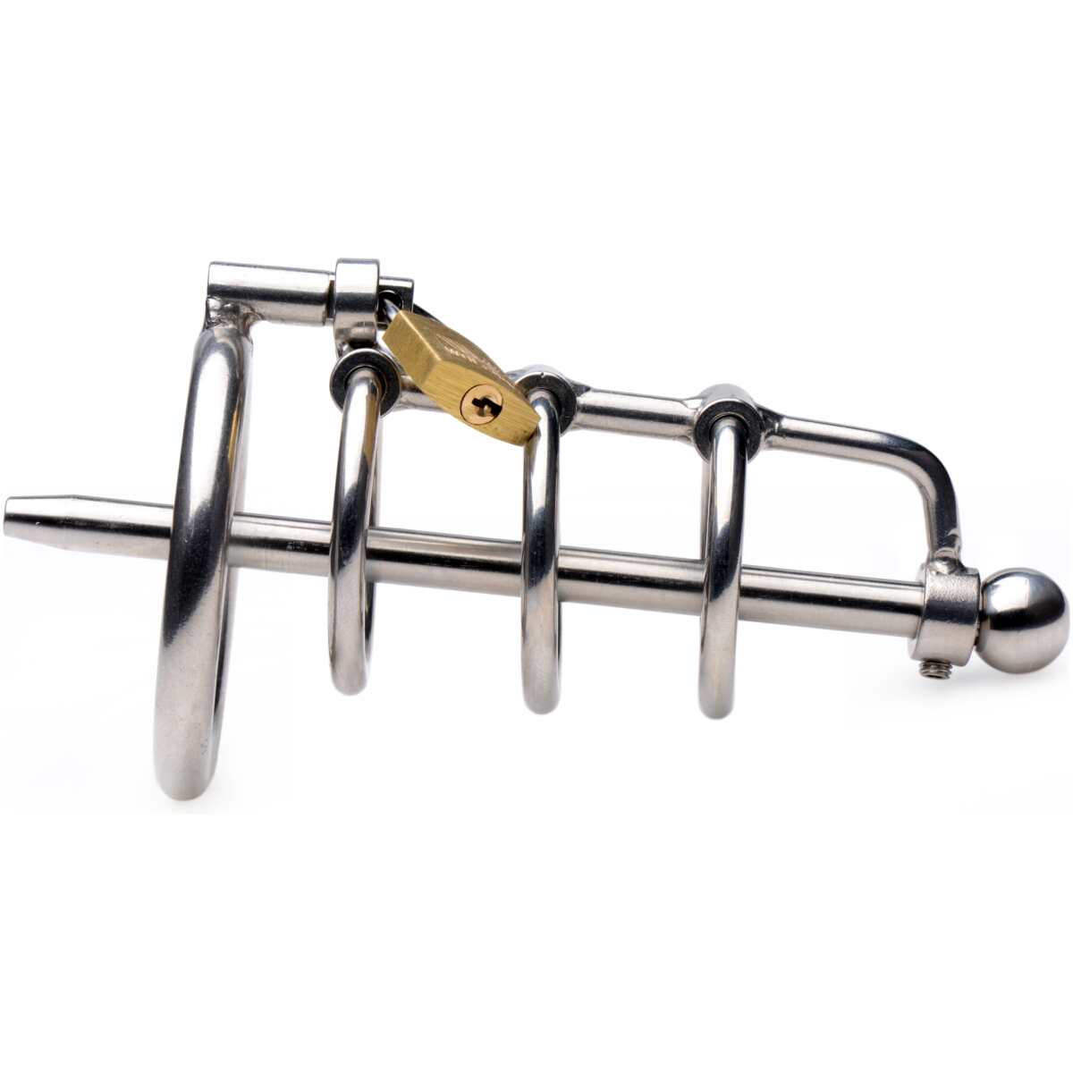 This adjustable sounding cage will hold your cock upright as the hollow urethral insert slides deep inside. The floating sound is capped with a ball, and features a hollow core for liquid to pass through. Each ring is hinged for a better fit, and an Allen wrench is included so that you can clamp the insert in place once you have reached your desired depth.