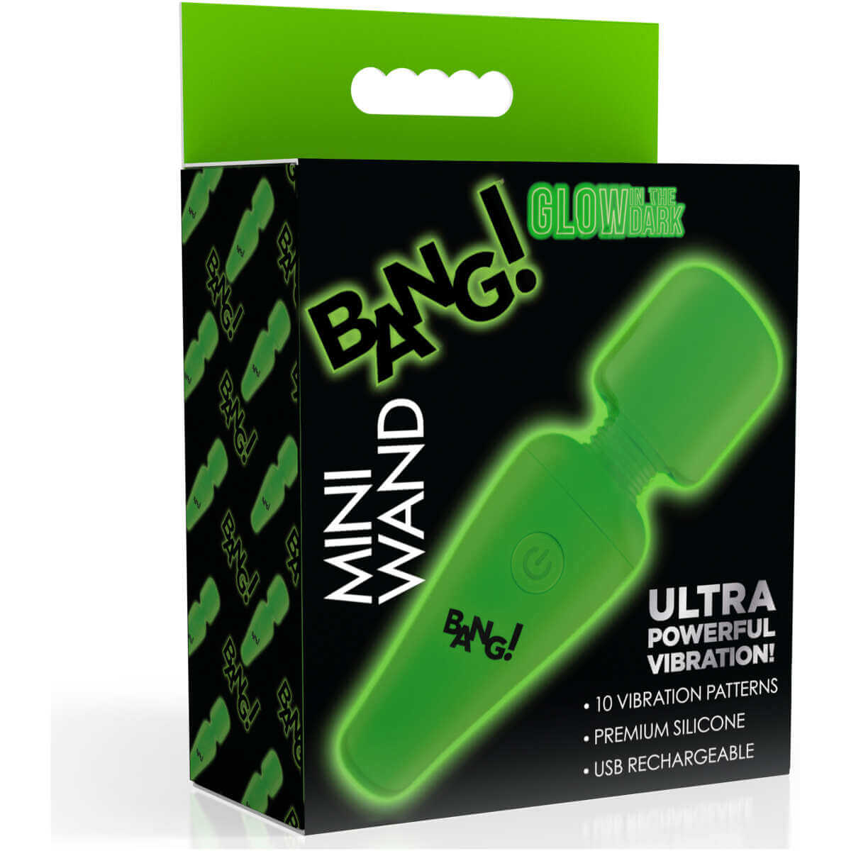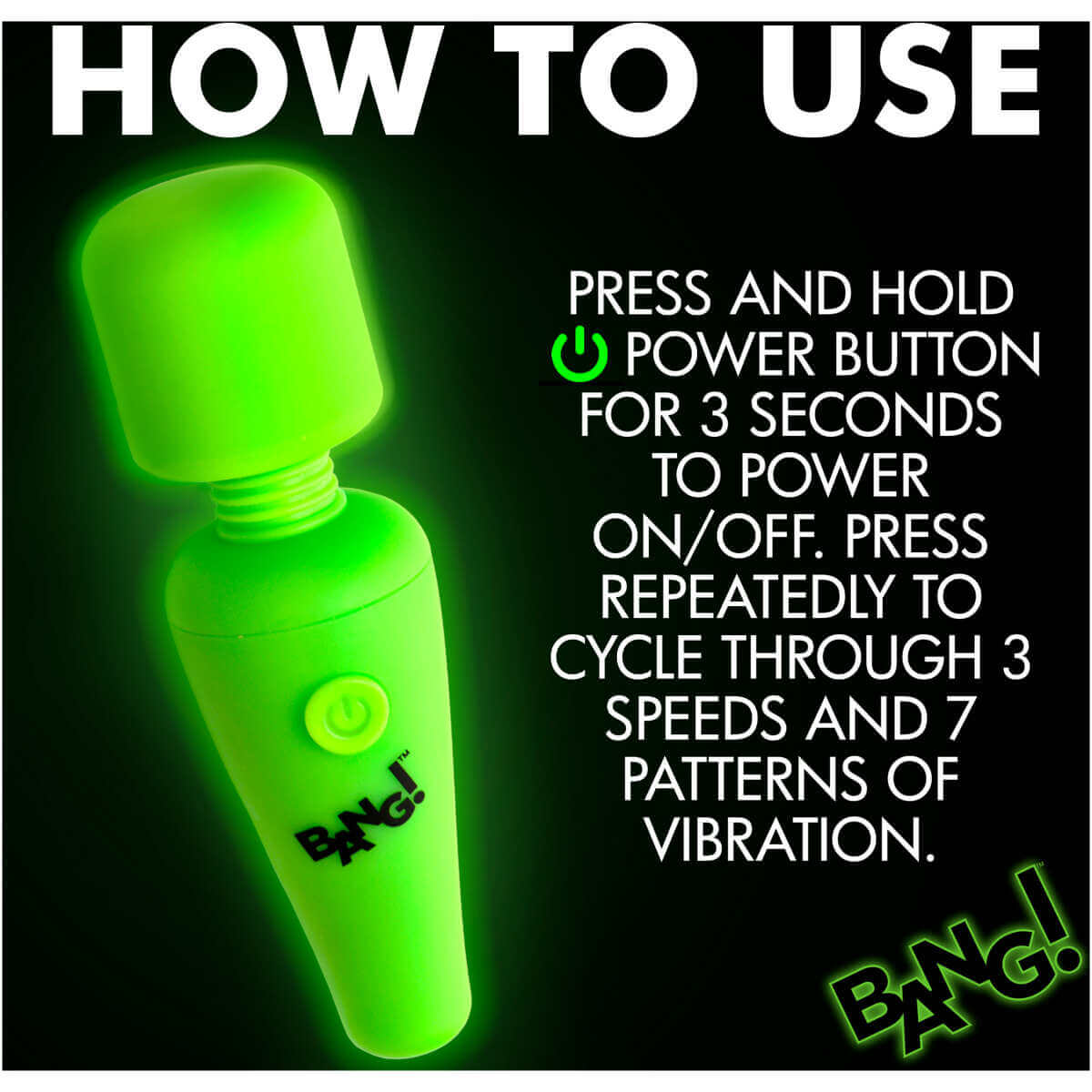 Enjoy this powerful, travel-friendly, glow-in-the-dark mini wand massager! With its wide, round head and flexible neck, you can get at any angle during your sensual massage. Expose it to light to charge up the glowing feature, then turn the lights off and have fun in the dark! This premium silicone wand is phthalate-free, body-safe, and best used with water-based lubricants only. Choose between 3 speeds and 7 patterns of vibration. Recharge via the USB cable provided. After each use, wash it with warm water and mild soap, then rinse it off and spray it with a toy cleaner. Let air dry.