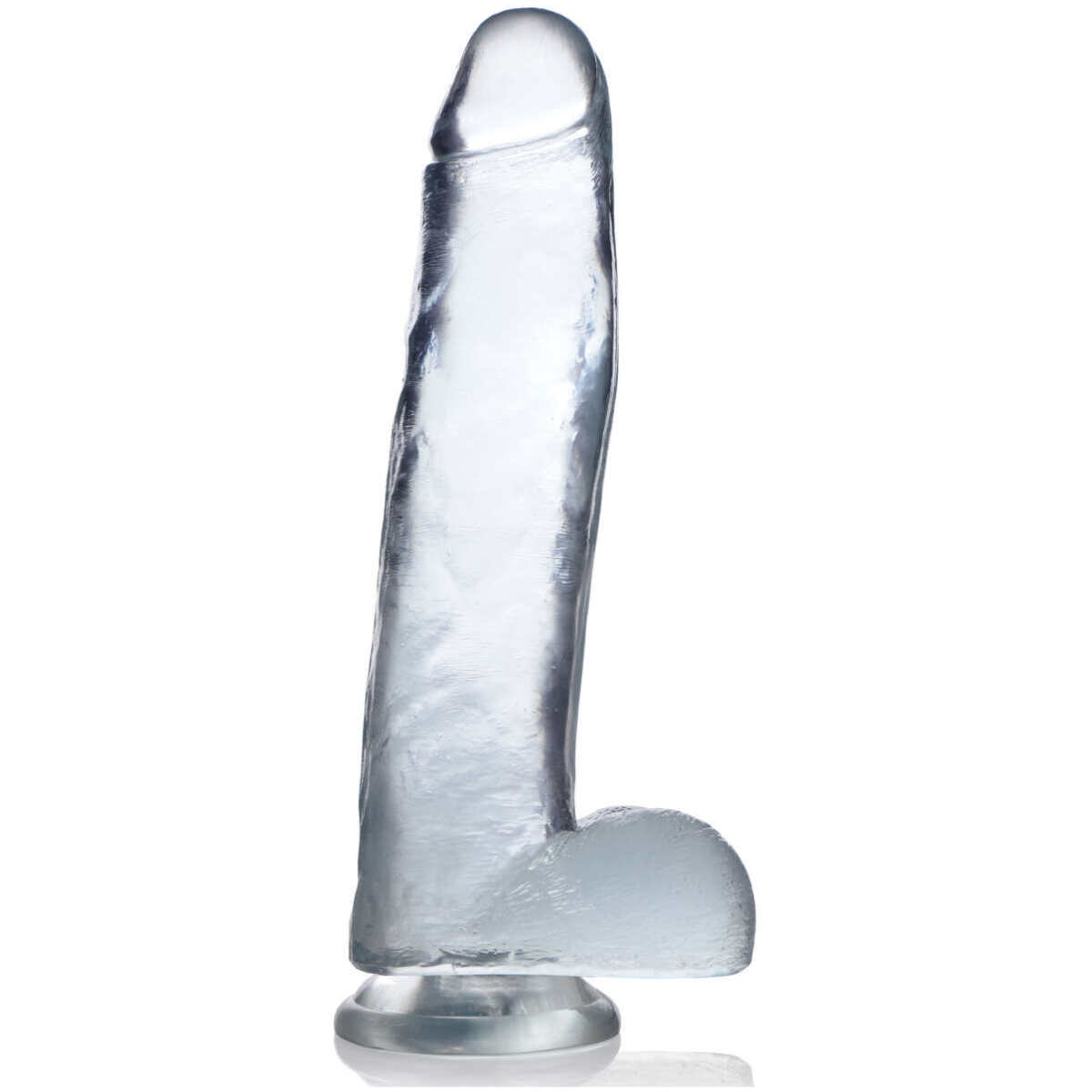 This crystalline cock is thick, clear, and hand crafted for peak pleasure. Perfectly sculpted with lifelike details and a meaty ballsack, this massive 11 incher is great for veteran size queens or kings. Designed to be low maintenance and easy to clean so you can play hassle free and focus on your pleasure.