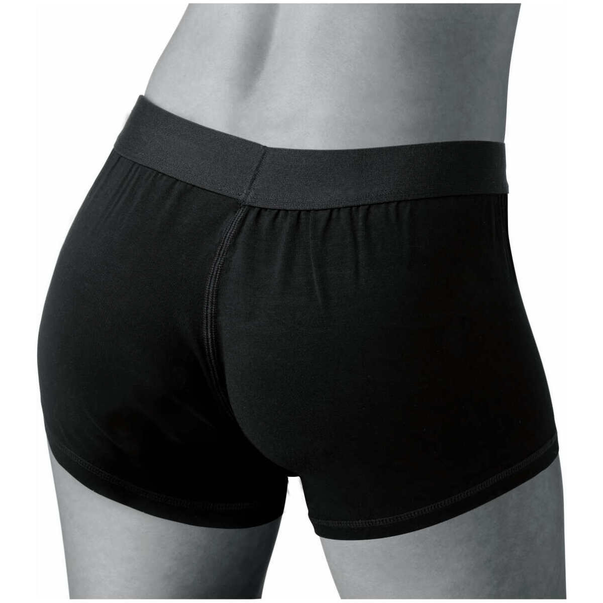 Feel more comfortable and stylish than ever before when you strap on your favorite dildo. This boxer brief style harness feels just like underwear, with an O-ring that stretches to accommodate most dildo sizes. You can even wear these cotton shorts out under your clothing, or stuff them with your favorite packer. This harness is excellent for extended wear. The supportive elastic waistband will carry the weight of your dong and you will be allowed greater mobility and position versatility. This harness is recommended for use with dildos that have a flat base that is 1.75 inches or wider. Machine washable.