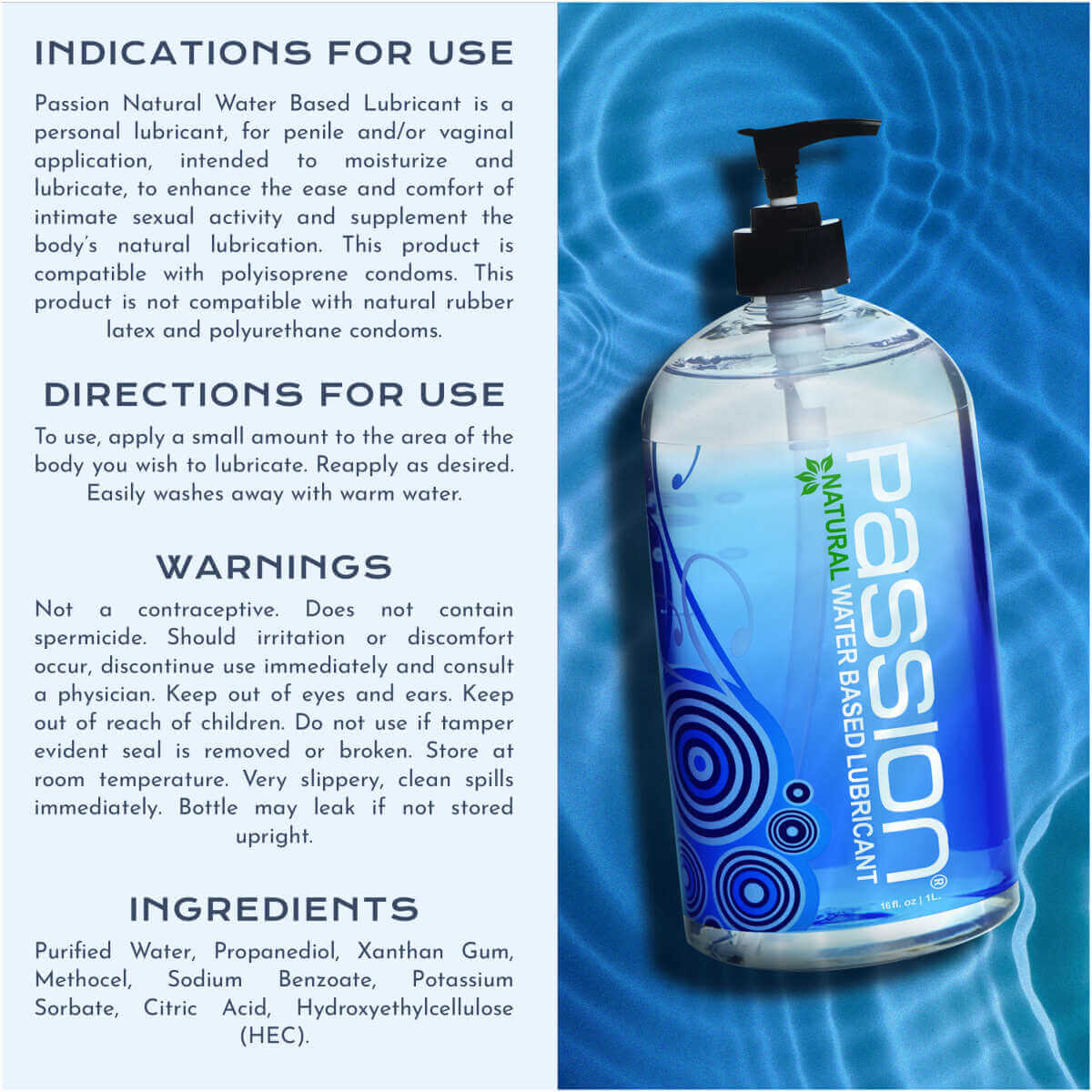 Get nice and wet for some steamy action with Passion Natural Water-Based Lubricant. With its superb formula you will have a natural feel that keeps you moist longer for those extended wild bedroom sessions. This lube also works great with all toy materials for your private sessions. Comes in an easy to use spill proof bottle perfect for those who enjoy adventures on the go, so lube up and get ready for Passion! Passion is petrochemical-free, glycerin-free and paraben-free. Washes easily with soap and water