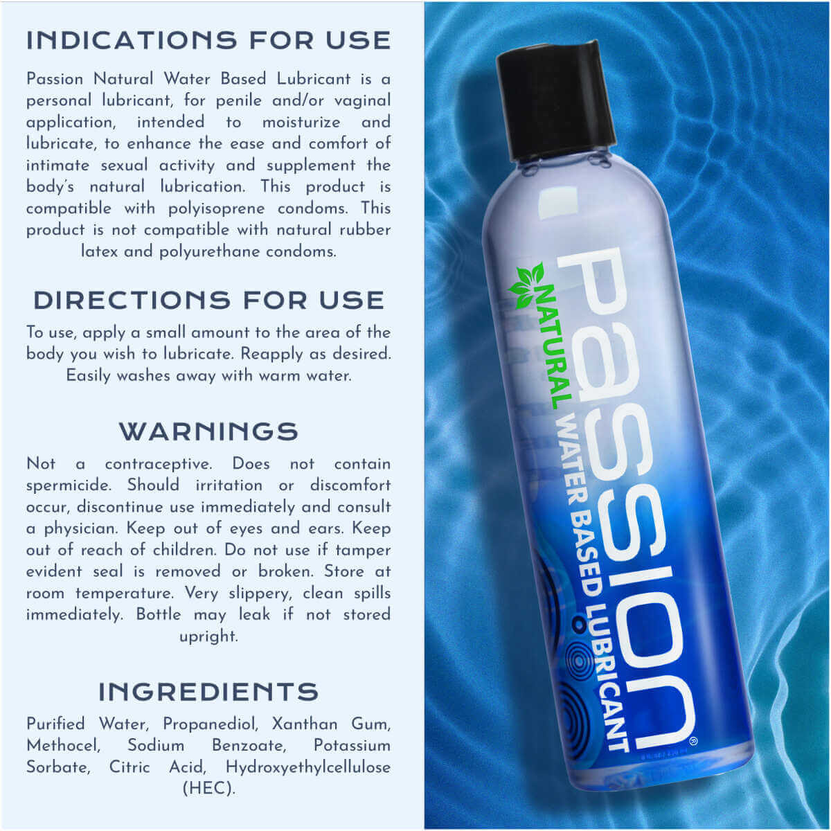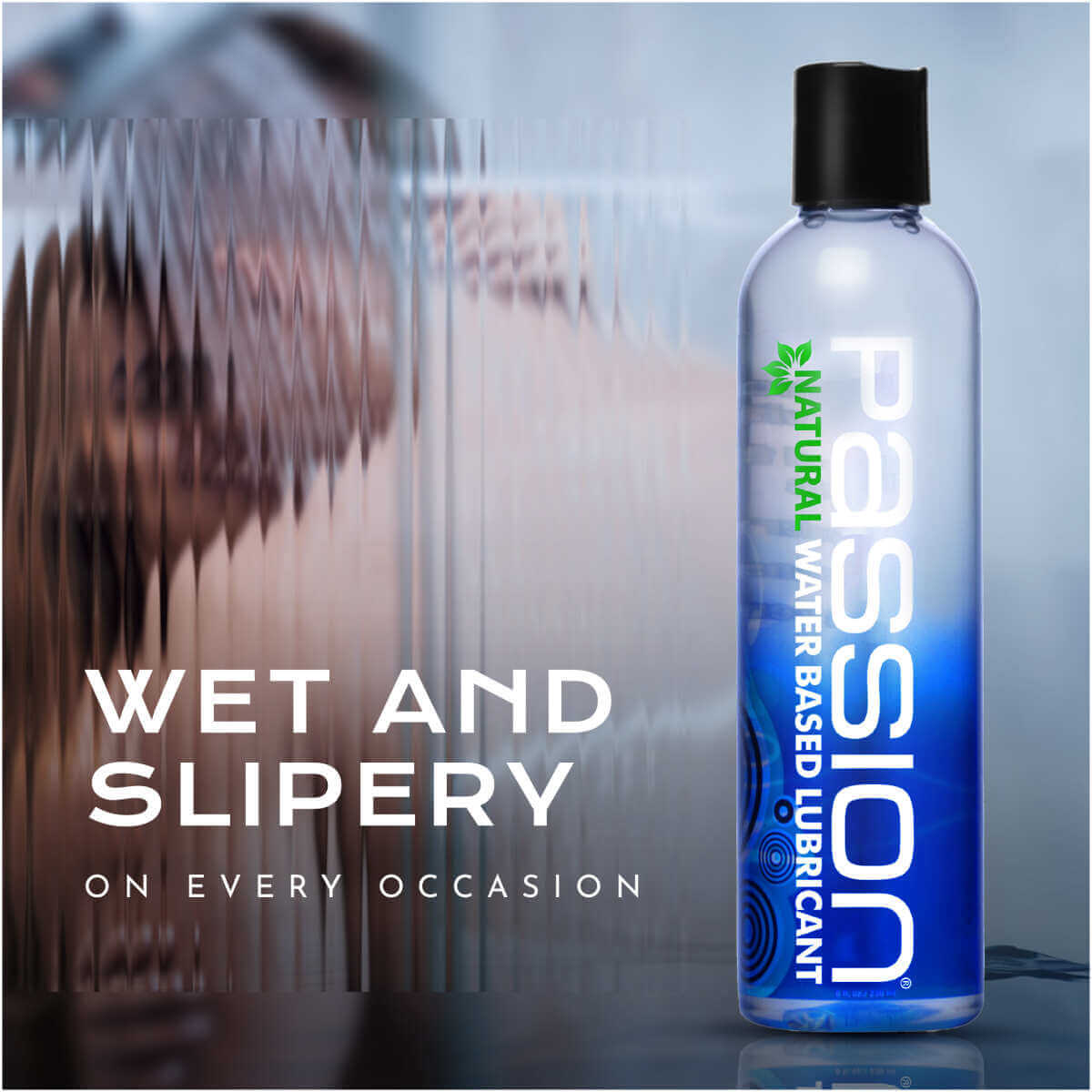 Get nice and wet for some steamy action with Passion Natural Water-Based Lubricant. With its superb formula you will have a natural feel that keeps you moist longer for those extended wild bedroom sessions. This lube also works great with all toy materials for your private sessions. Comes in an easy to use spill proof bottle perfect for those who enjoy adventures on the go, so lube up and get ready for Passion! Passion is petrochemical-free, glycerin-free and paraben-free. Washes easily with soap and water