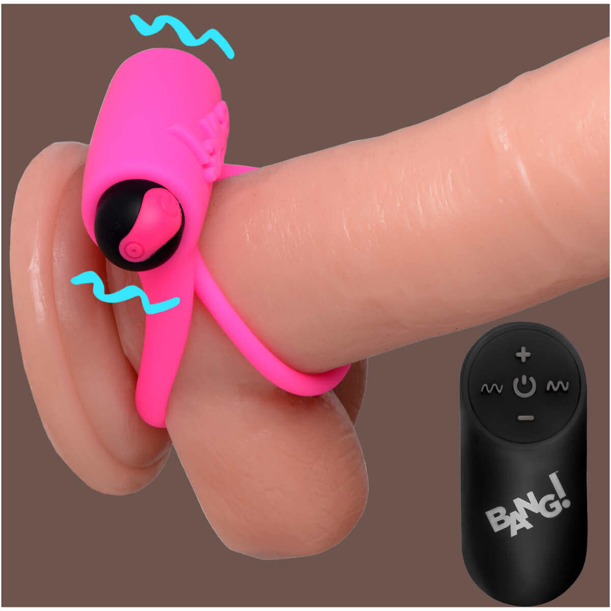 Enhance your cock with this velvety silicone ring and vibrating bullet combo! This Cock Ring from Bang! features two stretchy rings, one for your shaft and one for your sack, to increase erection hardness and duration while providing a satisfying hug. This powerful silicone ring also features an intense bullet vibe strategically placed to stimulate your lovers clitoris with every thrust!